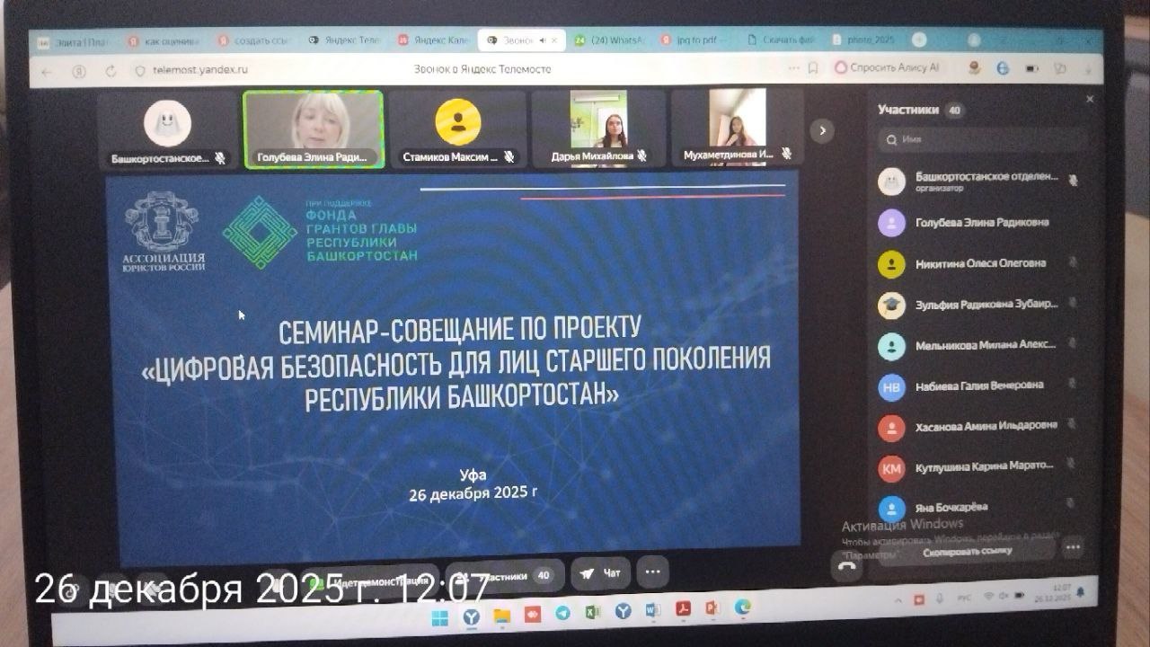Башкортостанское отделение Ассоциации юристов России в рамках реализации проекта «Цифровая безопасность для лиц старшего поколения Республики Башкортостан» провело обучающий семинар-совещание в формате видеоконференции с инициативной группой по подготовке лекторов.