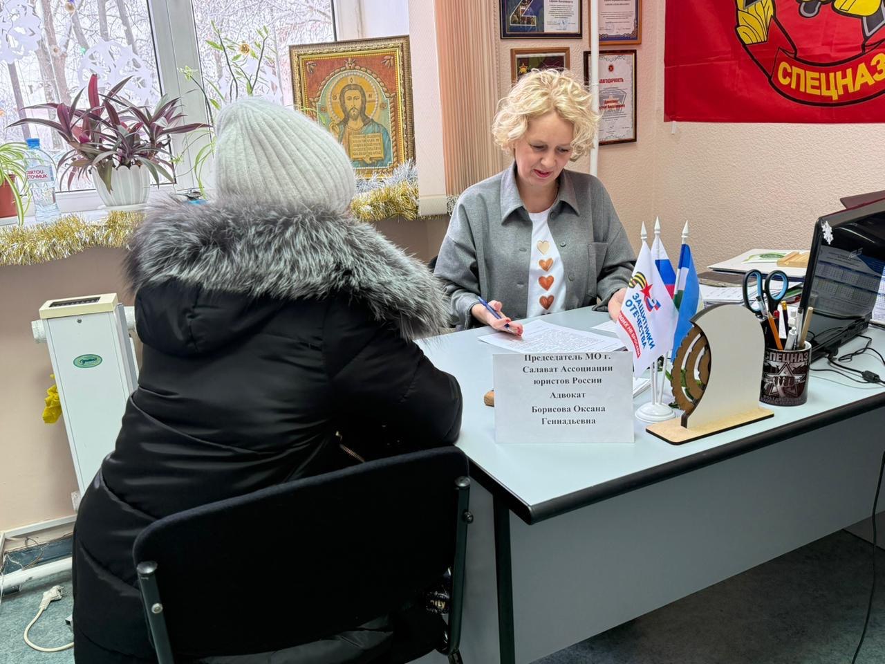В салаватском филиале благотворительного фонда «Защитник Отчества» состоялся еженедельный бесплатный прием граждан по правовым вопросам. Его провела председатель местного отделения Ассоциации юристов России, адвокат Оксана Борисова.