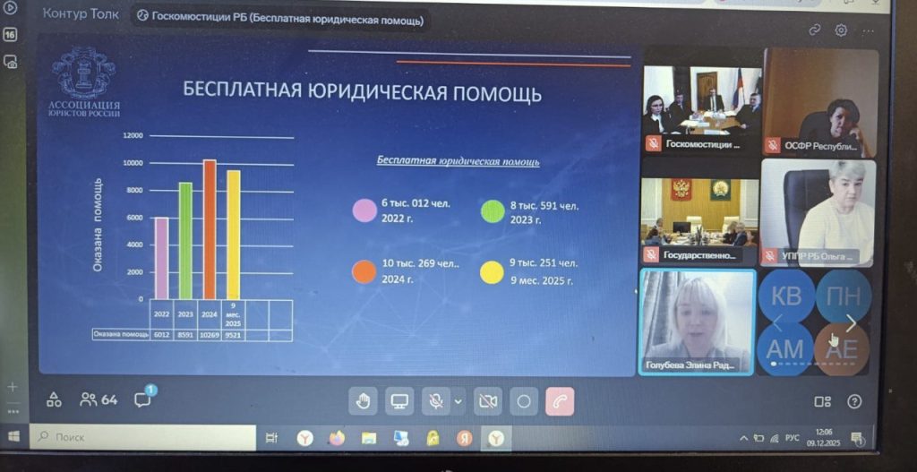 9 декабря 2025 года в режиме ВКС состоялся семинар-совещание, посвящённый организации бесплатной юридической помощи и правовому просвещению граждан в Республике Башкортостан. В мероприятии организованном Госкомитетом РБ по делам юстиции приняли участие представители органов власти, нотариата, адвокатуры и общественных организаций.